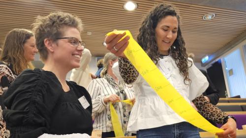 Deltagere på en af forårets Alle kan læse-konferencer afprøver opgaver fra undervisningsmaterialet OUT. Her leges der med procentelastikker.